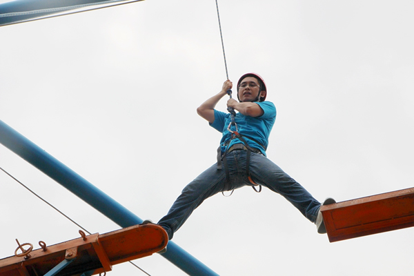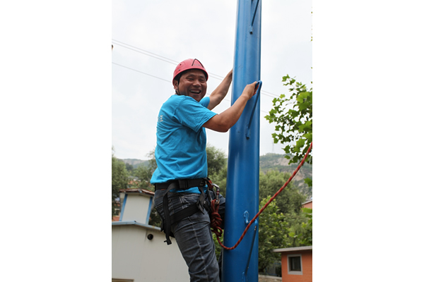 此次拓展訓(xùn)練加大了難度,增加了高空斷橋項(xiàng)目。挑戰(zhàn)人員需自行爬上八米的立柱,從很窄的木板上走過,然后跨越到一米半以外的另一塊木板上,然后從兩塊木板中間跳下。雖然有保險繩保護(hù),但對于參與者的心理和體力還是一個很大的挑戰(zhàn)。