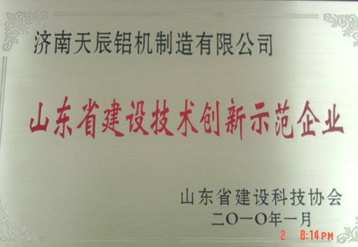 ??? 2010年2月26日山東省住房和城鄉(xiāng)建設(shè)廳在濟(jì)南南郊賓館召開全省建設(shè)科技工作會議,隆重表彰了全省建設(shè)科教工作和墻材革新建筑節(jié)能工作先進(jìn)集體、先進(jìn)個(gè)人,省建設(shè)技術(shù)創(chuàng)新獎(jiǎng)評獎(jiǎng)結(jié)果和省建設(shè)技術(shù)創(chuàng)新示范企業(yè)、建筑節(jié)能優(yōu)秀示范工程名單。天辰鋁機(jī)公司獲省建設(shè)技術(shù)創(chuàng)新示范企業(yè)。